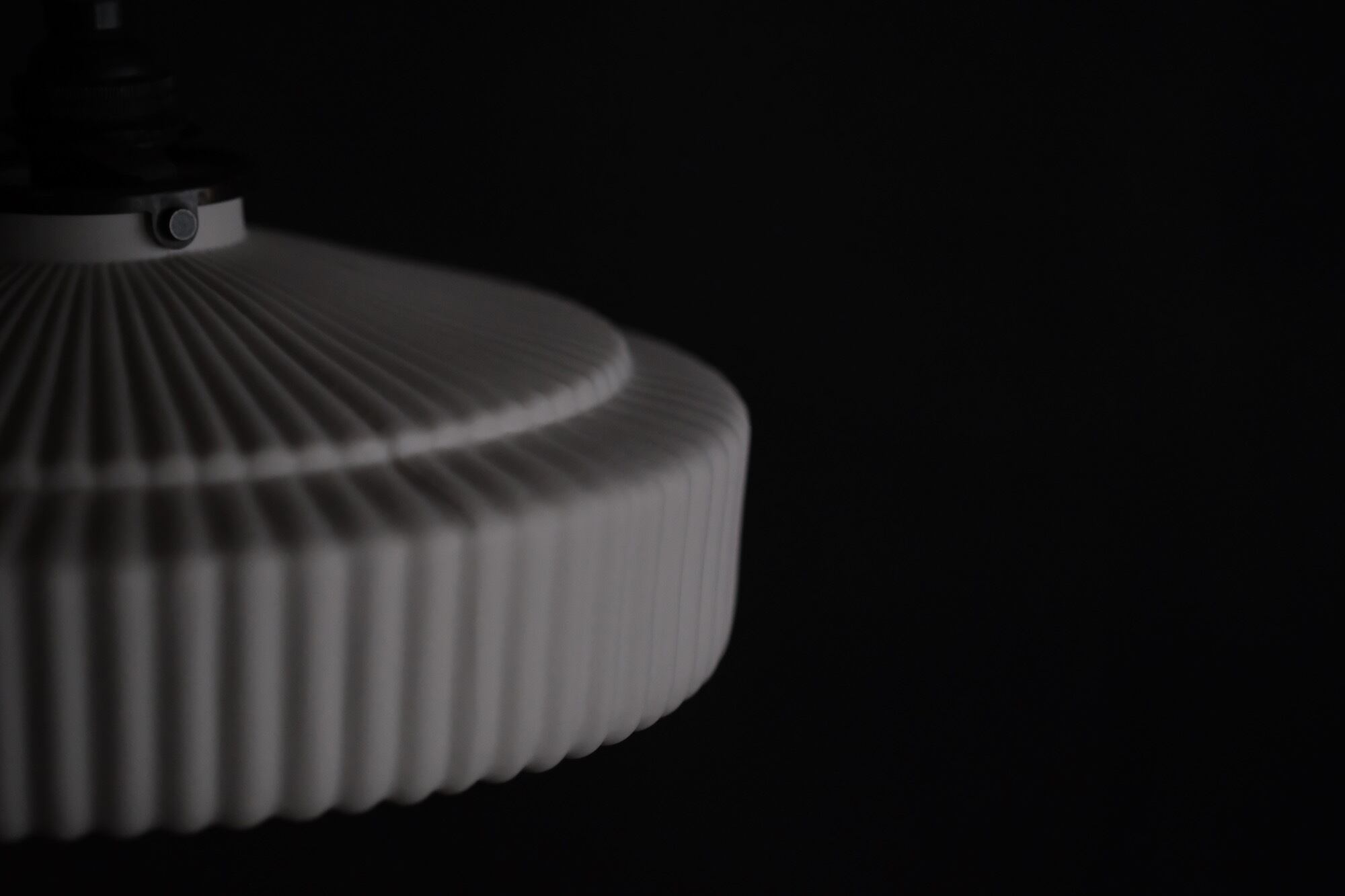 側面に施された規則正しいリブ(ストライプ)が、直線的な美しさを強調します、。高面積なシェードに刻まれた繊細なラインは、点灯時には深みのある陰影を、消灯時には工芸品としての端正な表情を見せてくれます。