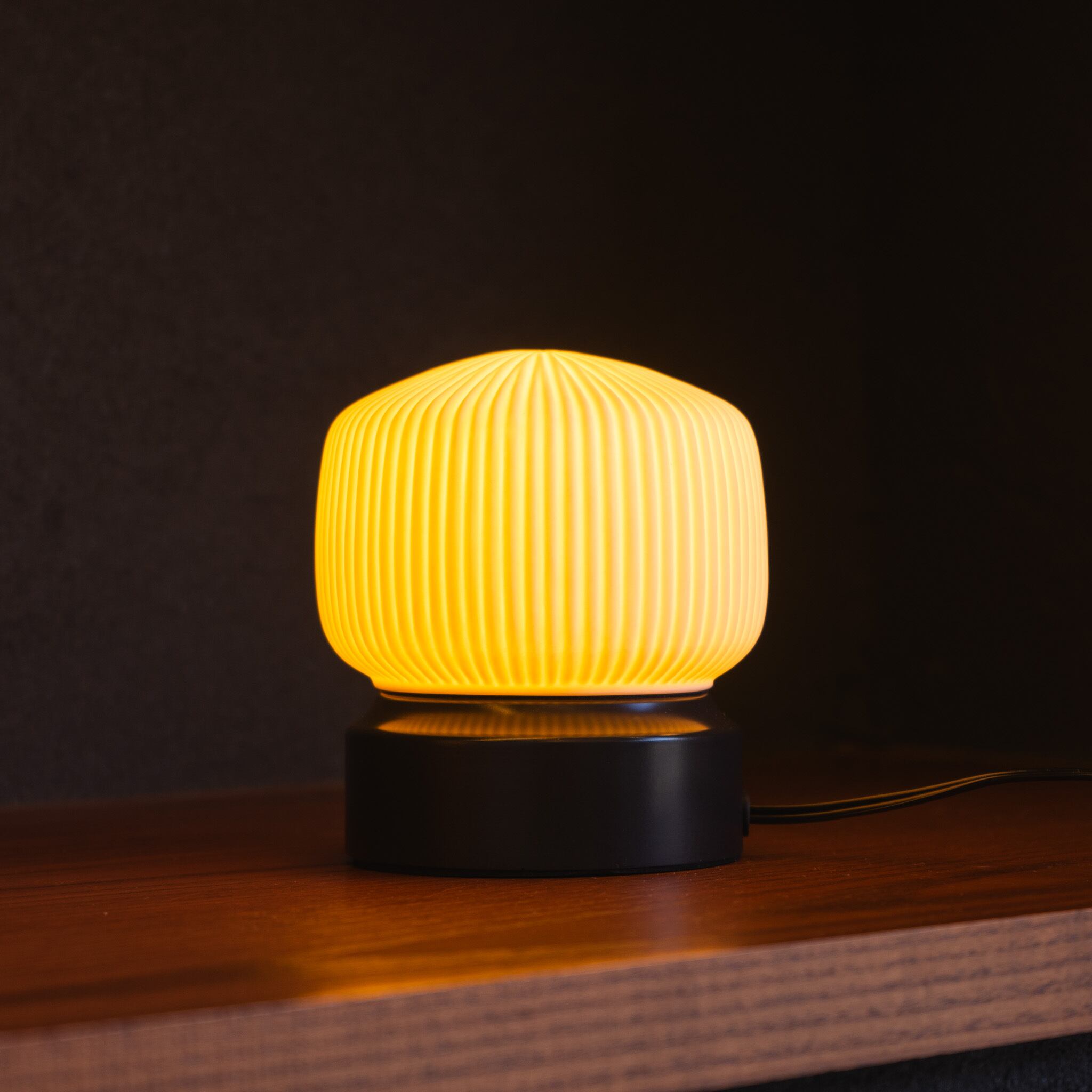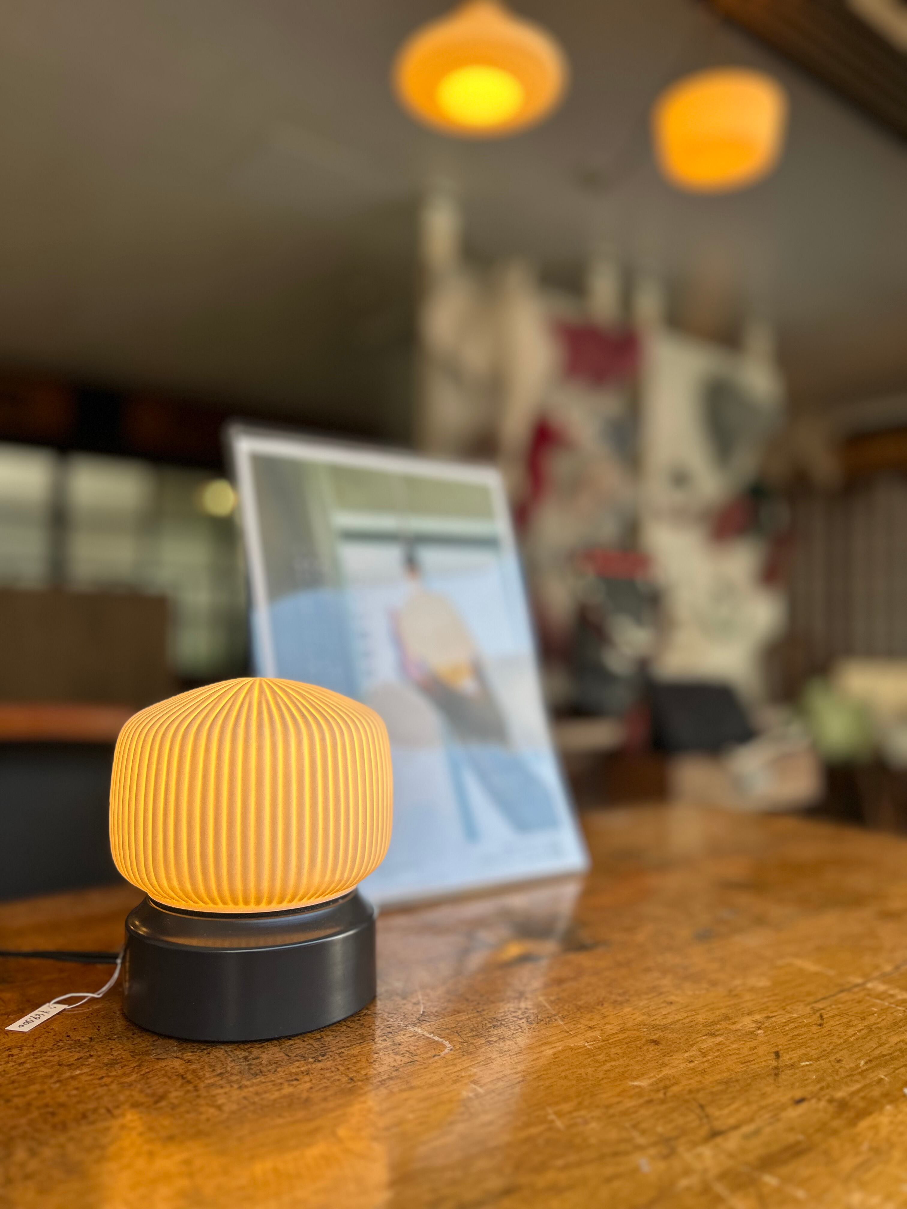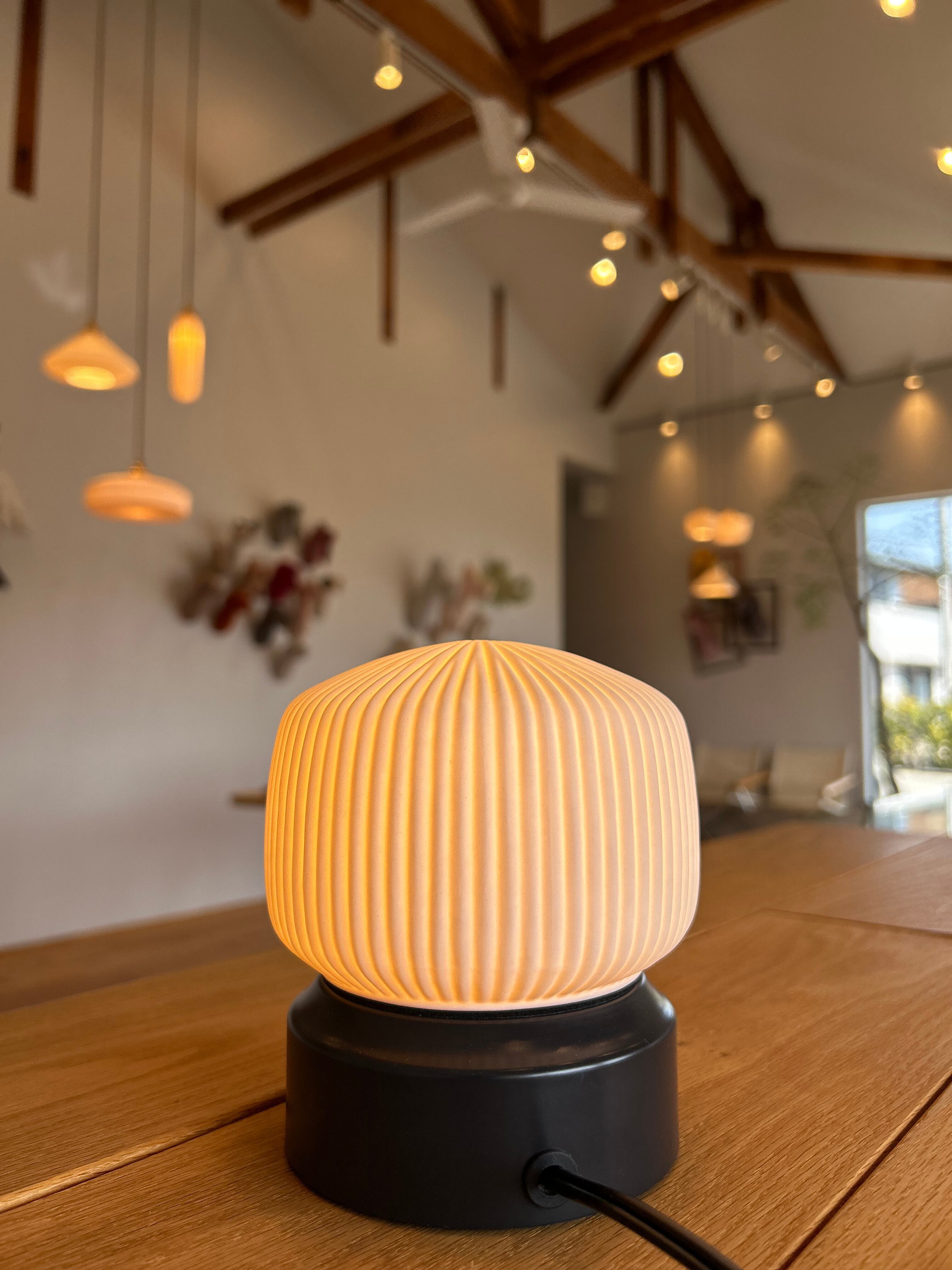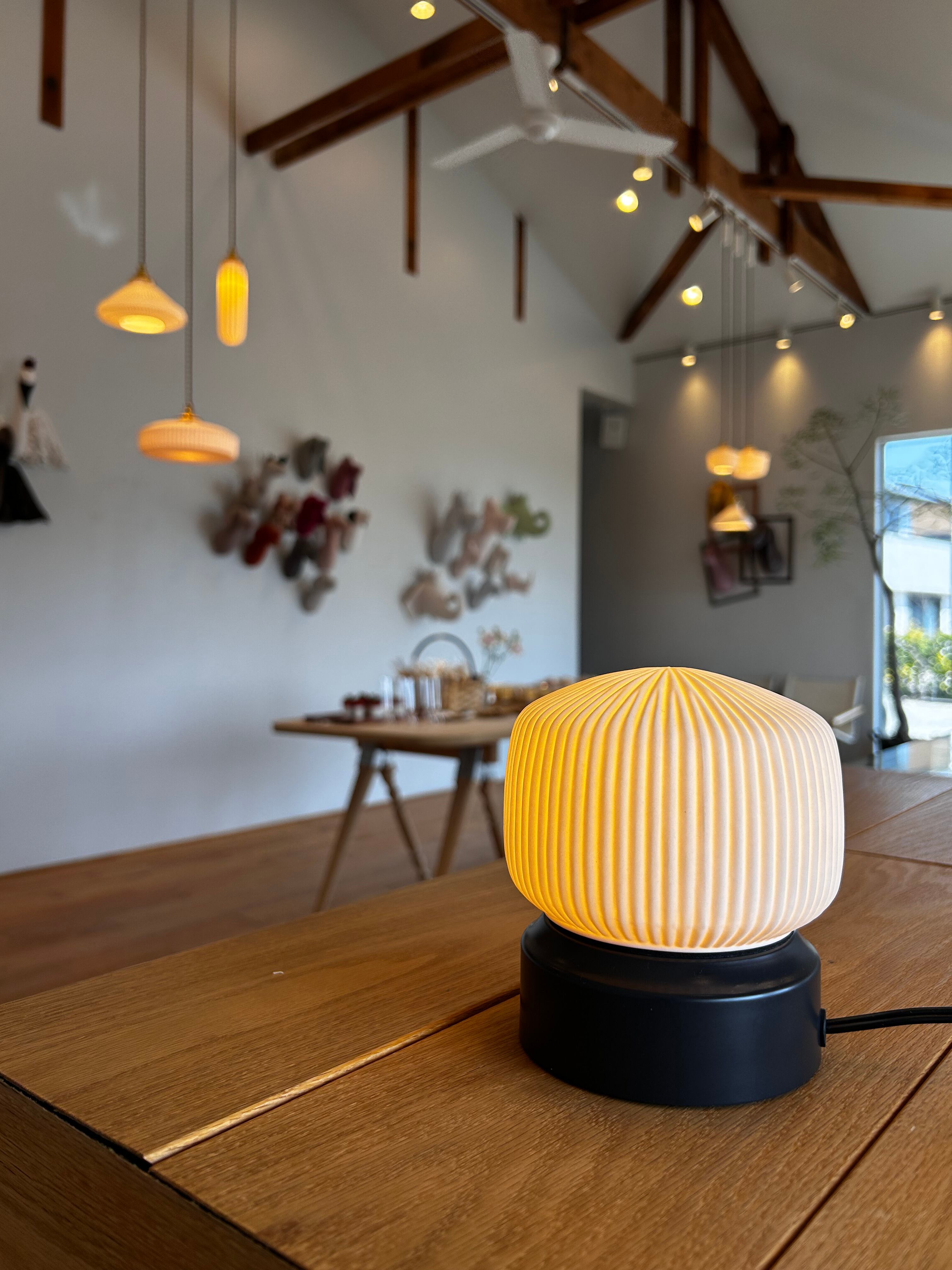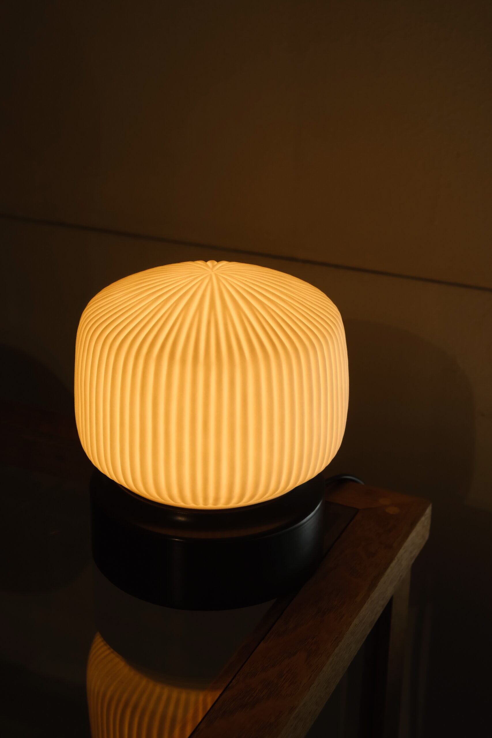 ペンダントライトとしての美しさはそのままに、卓上で愉しめるコンパクトなサイズ感が魅力です。磁器越しに溢れる琥珀色の光が、デスクやベッドサイドに静かな安らぎをもたらし、消灯時も端正なオブジェとして空間を彩ります。